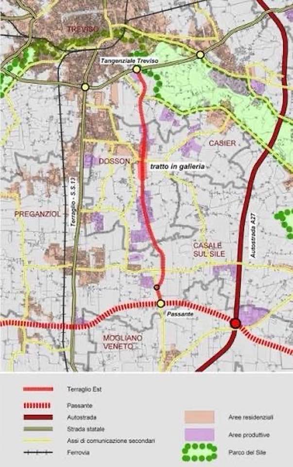 Credo che a un master universitario sulla pianificazione urbanistica il Terraglio Est potrebbe essere indicato come il modello sui limiti da non superare nella progettazione di nuove infrastrutture. Ci troviamo di fronte ad una aberrazione urbanistica e ad una follia progettuale, conseguenza di un esercizio del potere arbitrario assoluto e sconsiderato, ecologicamente e socialmente. Un’area, quella tra Mestre e Treviso, servita da tre vie di comunicazione: un collegamento ferroviario, il Terraglio (S.S.13) e l’autostrada A27. Parliamo di tre vie di comunicazione che corrono parallele e non distano tra loro che una manciata di chilometri, come si può vedere dalla foto dell’Associazione ”Salvaguardia Ambiente Treviso Casier”. Ora, affiancare loro una nuova arteria stradale (la quarta via di comunicazione) è un attentato ecologico per il consumo di suolo che determina, assolutamente dannoso, al limite della provocazione nell’esercizio dell’investitura elettorale ricevuta.