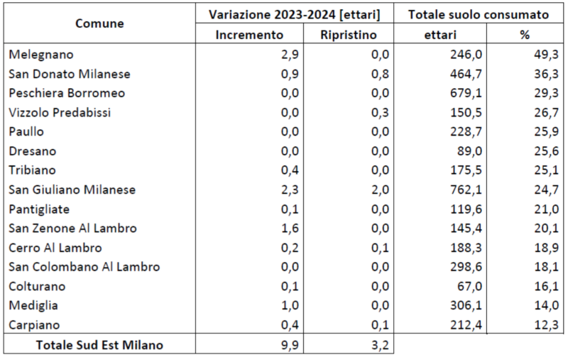 Come sempre la maglia nera spetta a Melegnano con il 49,3% di suolo consumato e con un incremento nell’anno del 2,9%. A Melegnano i corpi idrici occupano 11 ettari, quindi, dato che non si può edificare sul Lambro, la percentuale di suolo disponibile diminuisce di oltre il 2%. Il sindaco, nel brindisi pubblicato su Il Cittadino il 31 dicembre 2025, ci ricorda che: “Dal punto di vista urbanistico poi la città sta crescendo e si sta trasformando anche e soprattutto con l’arrivo del Data Center, nella zona ovest, già operativo con un primo lotto”. Dimentica di dire che sull’area di un nuovo ipotizzato data center esiste un bosco e che, a tutela del bene arboreo, è stata inviata al comune e alla proprietà una diffida.